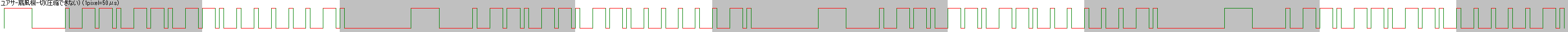 信号長が長くて手ごわいエアコンが学習できたので、これでなんでも学習できると気を良くしていたが、たまたま YUASA というメーカーの扇風機のリモコンが学習できないのに気付いた。いや、学習はできるが、うまく圧縮できていなくて、ボタン1つを学習しただけで EEPROM を半分以上消費してしまう。パターンを見てみると、データ長は極端に長くはないが、ちょっと困った特徴がある。