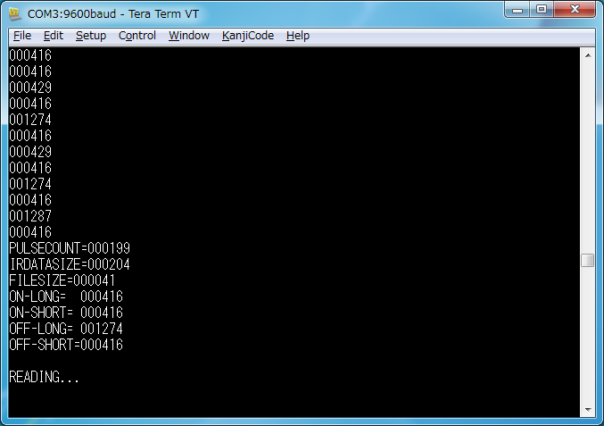 ファームウェアの大改変を行った。改良点は (1)どのリモコンでもモードAで学習できるようにした(モードの切り替えが不要になった)。(2)デバッグモード追加。学習した信号をシリアルに出力できる。(3)デバッグモードを使って各社のリモコン信号を観察して、圧縮アルゴリズムを改良した。新しいファームウェアはまだあまりテストしていないので未公開。テスト後にコードを整理して公開しよう。