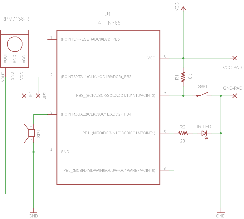 | 4* | 消費メモリ確認 | 短押し×7回 | 学習済みの信号が消費しているメモリ(EEPROM)量に応じてBEEPを鳴らす。対象は直前に No.1 で送信したメモリ番号。BEEP1回が32バイト。 |