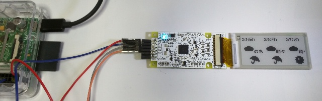 電子ペーパーに天気予報を表示します。ラズベリーパイでインターネットから天気予報データを取得して、電子ペーパーに天気予報を表示します。データはひとくち予報 in Feedから使用させていただいてます。